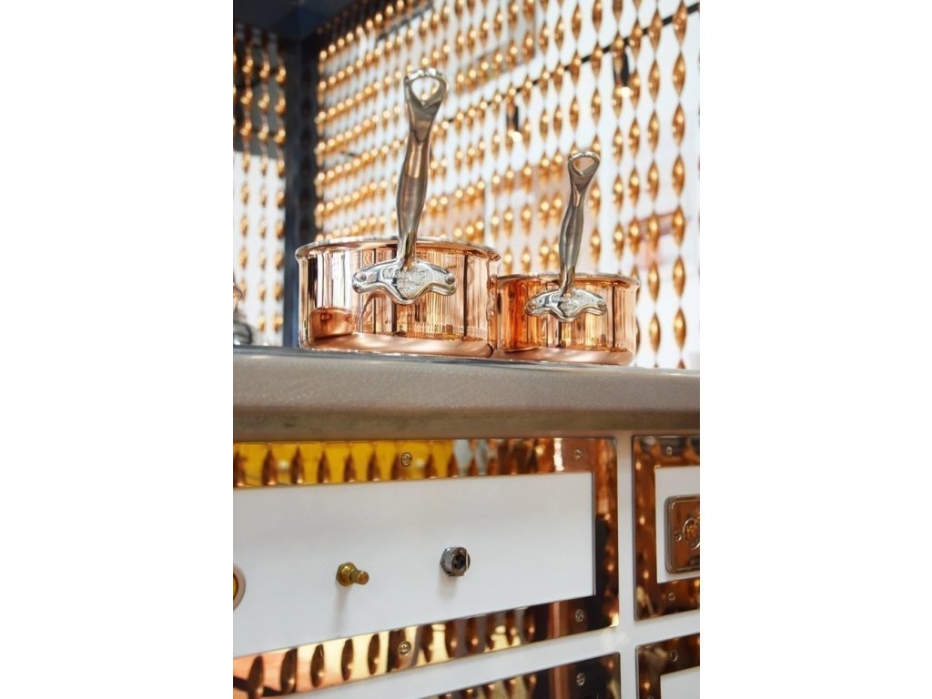 Francouzský výrobce Mauviel 1830® zúročil své zkušenosti z předchozích let a v roce 2019 přichází s novou kolekcí měděného nádobí, která je vyrobena ze 6 vrstev o celkové tloušťce 2,7 mm, na rozdíl od té předcházející, která měla pouze vrstvy 3 o celkové tloušťce 1,5 mm. Nádherná řada nádobí M’6S vyhlášeného francouzského výrobce Mauviel 1830® mohla být stvořena díky promyšlené kombinací 3 silných a tradičních materiálů a to nerezové oceli, vodivého hliníku a mědí.Tato směs materiálů je v řadě M´6S dovedena k dokonalosti, je naprostým technickým úspěchem, protože nádobí kolekce M´6S je nejen esteticky nepřekonatelné, ale i vhodné pro všechny typy varných ploch, včetně indukce. Vnitřní vrstva je tvořena nerezovou ocelí 18/10, která umožňuje snadné čištění. Pak následují 3 vrstvy hliníku, který je, stejně jako měď, výborným vodičem tepla. 5. vrstvu tvoří magnetická nerezová ocel, která reaguje s indukční varnou plotýnkou a 6., viditelnou vnější vrstvu, samotná měď, která je nejen designově nádherným materiálem, ale také vynikajícím vodičem tepla, velmi rychle reagujícím na změny teploty. Tímto způsobem je zajištěna jak rychlá a skutečně rovnoměrná distribuce tepla, tak i naprosto dokonalá kontrola nad připravovaným pokrmem.