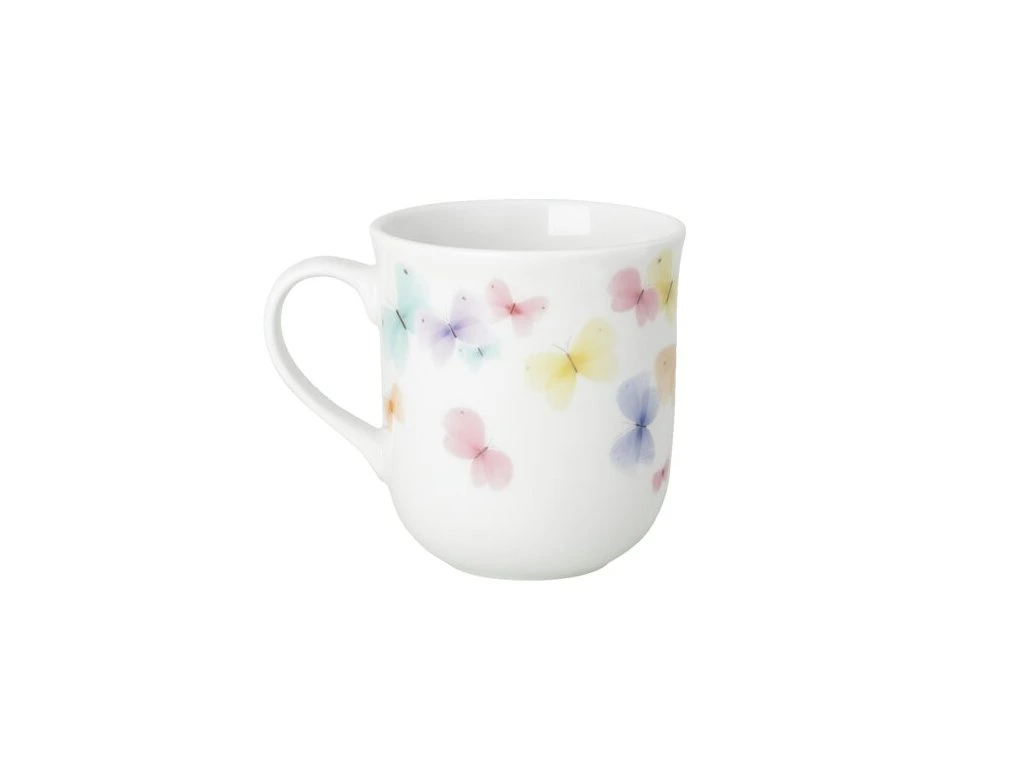 Hrnek z kolekce Spring Greetings značky Hutschenreuther zaujme jemným dekorem Schmetterlinge inspirovaným jarní přírodou a praktickým tvarem vhodným pro každodenní použití.